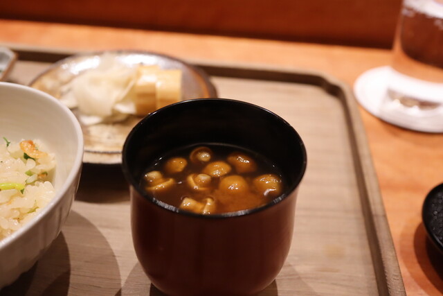 桜海老と?の炊き込みご飯 香の物 なめこのおみそ汁