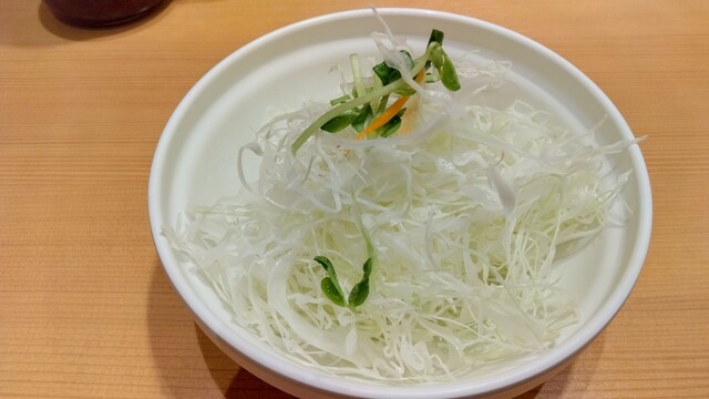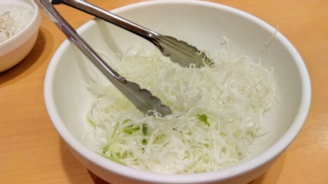 ごはん、味噌汁、キャベツ、お新香は食べ放題。