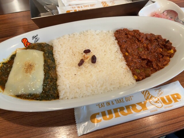 コンビネーションは細長いお皿の両端に2種類のカレーをよそって出てきます。今回はチキンキーマとほうれん草にしました。スパイスが独特で、ここならではな気がします。