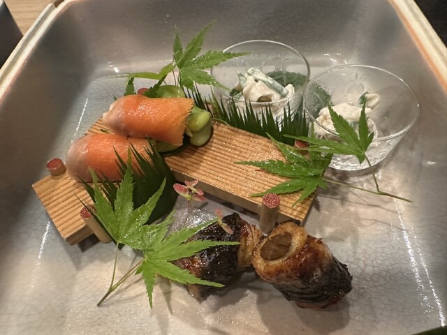 ○八寸 鰻八幡巻き スモークサーモン長芋巻き 一寸豆守口大根アスパラ白和え 茗荷 河内鴨ロースト 法蓮草お浸し 卵黄魚のすり身カステラ