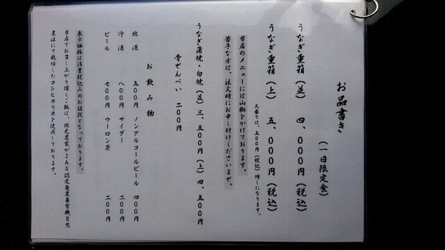 白焼と重箱で非常に迷ったが、せっかく天然ウナギの産地で食べるのだから白焼にした。確かに白焼に有りがちだという臭みは全くしなかった。味付けは塩で、ほんのりとした脂で外側はパリパリの焼き上がり。吸物の具は三葉とウナギの肝。