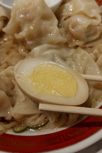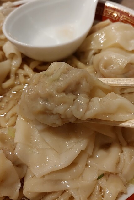 スープは割りとシンプルで控えめ、背脂が多いがくどくはない。ワンタンは大きいのが何個も入っていて、なかなか食べ応えがある。卓上調味料もワンタン用に色々あって、飽きることもない。高菜飯も付いて、これで総額1090円は恐れ入る。