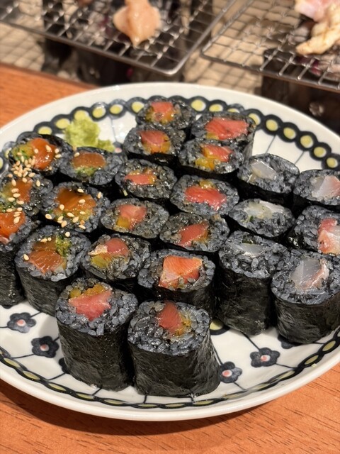 炉端焼きと寿司を“同じテンション”で楽しめるのがこの店の強み。コンセプトとしても、卓上で自分で炙れる体験と、竹炭を使った黒シャリ寿司が売りで、口コミで語られている特徴と実体験のズレが少ない印象でした。