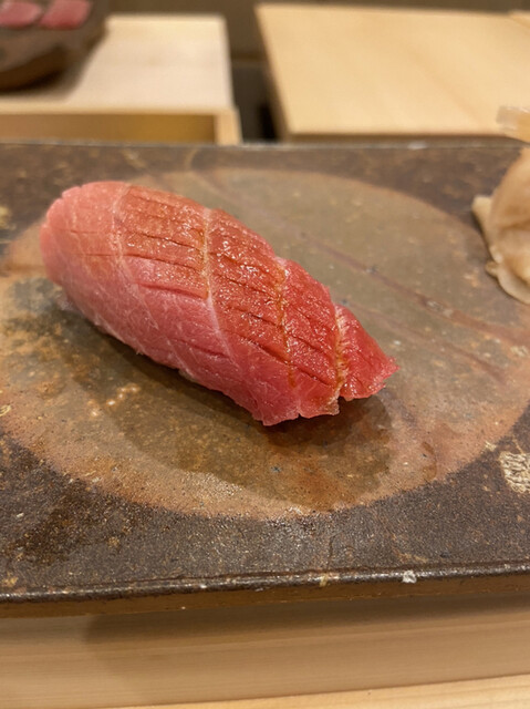 鮪中トロ…今回は、血合いぎしの中トロで、香り、旨み、酸味、甘みのバランスも良いし、余韻もヤバいです!