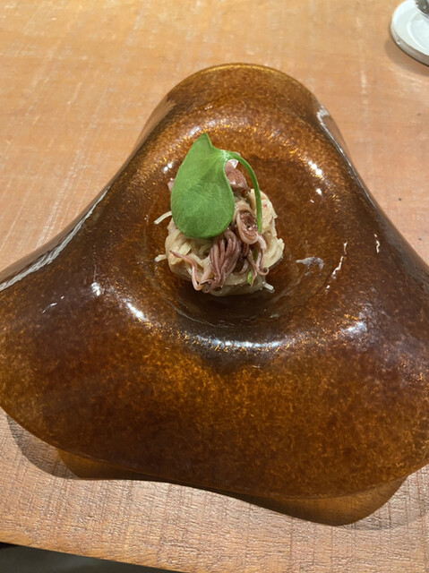 石垣貝と蒂紫茄子と蓴菜のコンソメジュレかけ…石垣貝!夏の貝ですね〜!ひと叩きするとムクっと起き上がった石垣貝と蒂紫茄子の揚げ浸し、蓴菜をジュレがまとめスルッと進みます!