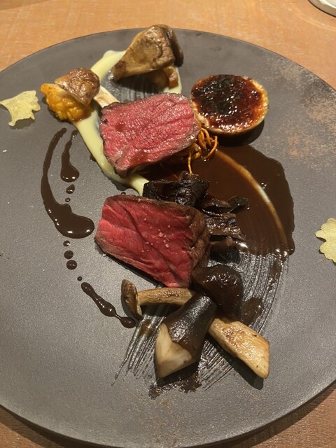 和牛あか肉のヒレ肉と様々なきのこ…無花果のキャラメリゼとサケツバタケ、ハタケシメジ、サナギタケ、金耳、香茸etsと初めて聞く様な茸がいっぱいでサナギタケは、別名冬虫夏草!シャキシャキと心地良く、香茸は香りが抜群でむせかえる様でお肉とソースと良く合います!