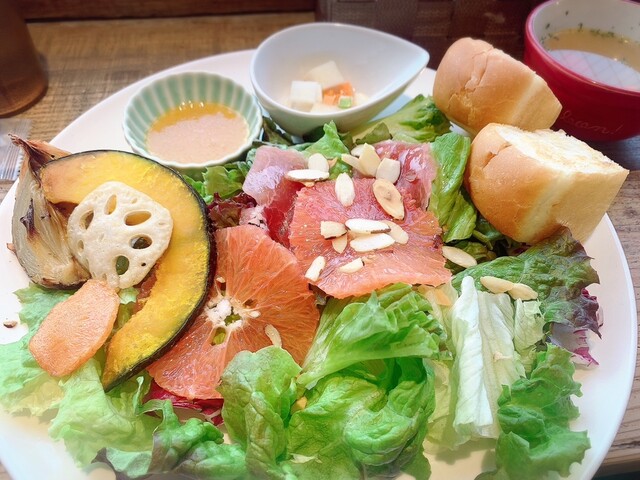 ベジタブル風味のドレッシングが甘酸っぱくて美味しかったです^^˚✧˳✧ピンクグレープフルーツのオレンジみとかぼちゃやレタスのカラバリが食欲をそそり、生ハムがのってるのも心うれしいポイントでした