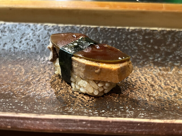 ほんとにどれも美味しかったですが、よく写真で見るあん肝と奈良漬はシャリと合うのかな〜。と最初半信半疑だったのですが、これがめっちゃ美味しかった・・・。