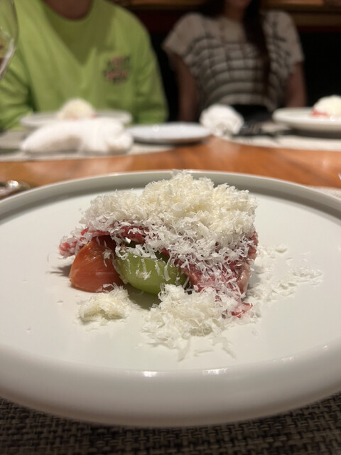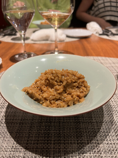 カルパッチョはたっぷりのチーズとマスカットと!これも美味しすぎるし、カニのリゾットも濃厚、香りやばい。