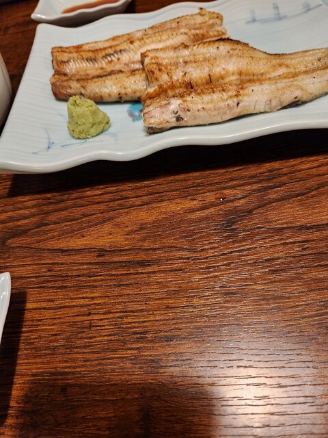 白焼き。うなぎ、お新香、肝吸い、酒笑