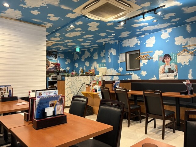 お店は2階です。階段登って2階に足を踏み入れると…おぉ?!空の壁紙(ではなく絵画?)がとても印象的。