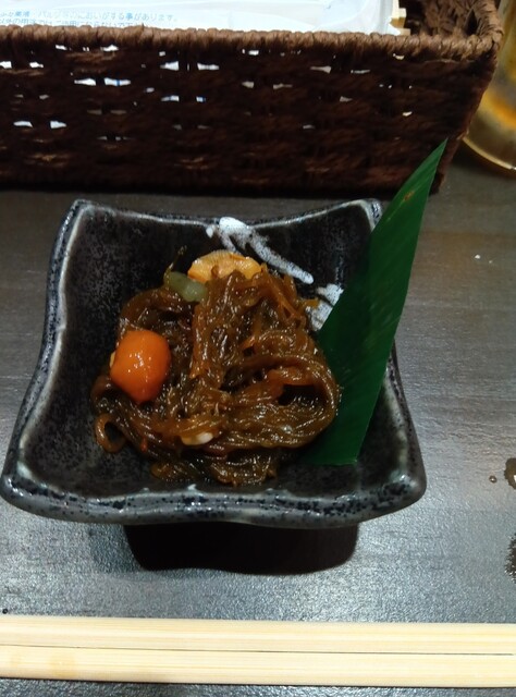 通しのもずく?も共につまみながら到着を待つ。店主のワンオペなのもあり、焼き物はある程度待つことを考えてこのように待っている間の一品を注文をしたほうがいい。