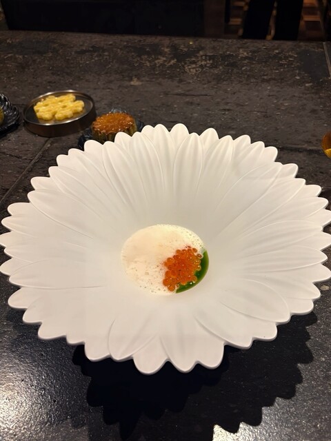 いくら、ニラのソース、カシューナッツの泡。