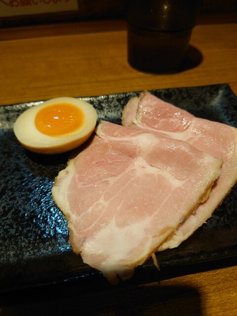私は煮干しラーメン、妻は塩ラーメン。赤みの残った豚チャーシューとさっぱりした鶏チャーシューは絶品。またプリプリした細麺が美味しい。妻の塩は麺が違い、少しもちもちした平打だった。