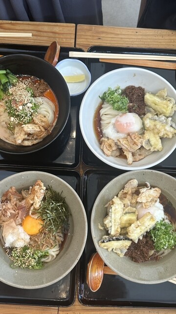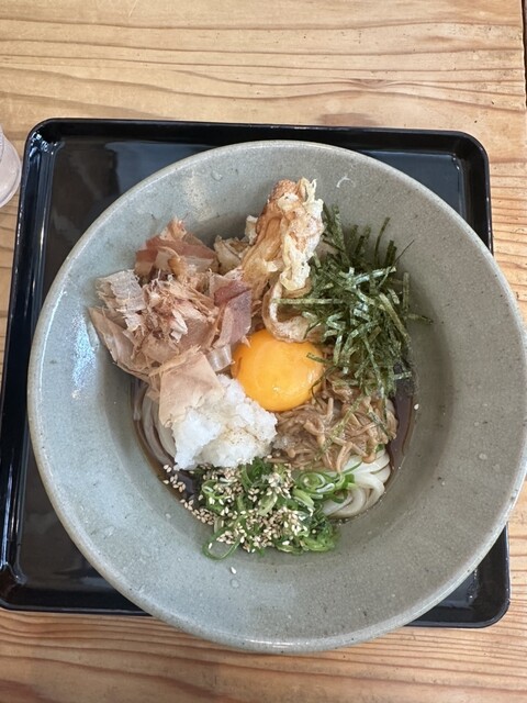 混ぜうどんに乗ってるトッピングがまた絶品。ごぼうチップに、今回は夏季限定のナスの辛子漬け。夏は冷やし混ぜうどんがおすすめ。店主さんが丁寧につくられてるのがよくわかるおうどんのビジュアル。