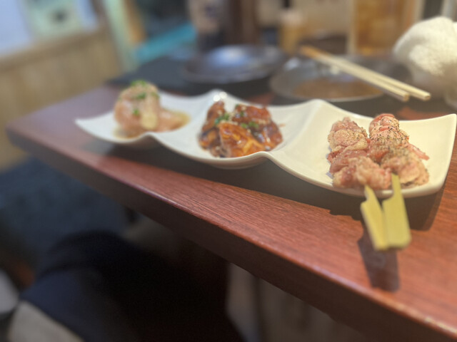 「三種盛り合わせ(1045円)」は、ムネの塩焼きのさっぱり感、モモ玉味噌のもっちりした旨み、心のこりのコリコリ食感と脂のジューシーさ、それぞれに個性があって飽きずに食べられるセットでした。
