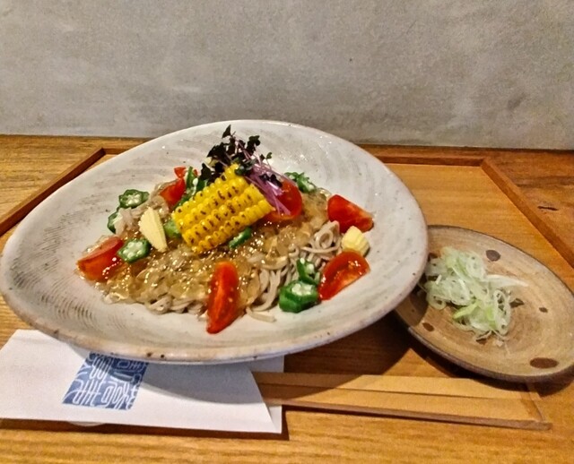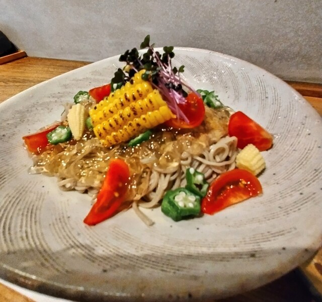 トッピングはあま〜い永平寺産のとうもろこしに甘くて味の濃ゆい福井が誇るトマト、越しのルビーにオクラ、ヤングコーン、ベニーナ!