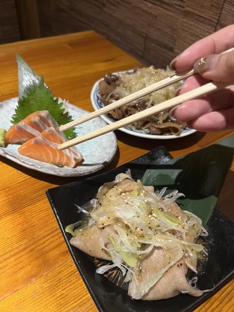 最初はサラダかなー、と思っけど、お通し大盛りの塩ダレキャベツだったのでちょっと一旦悩んで、最初から目を付けてた山盛りの牛タンと、牛タン肉寿司という牛タン三昧からスタート。