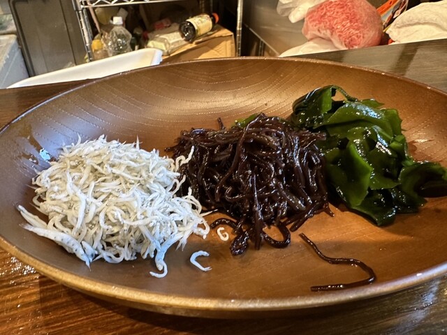 わかめとコリコリした海藻としらす、マスター特製のポン酢で