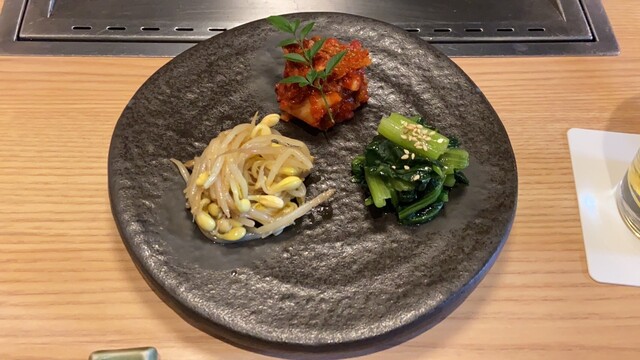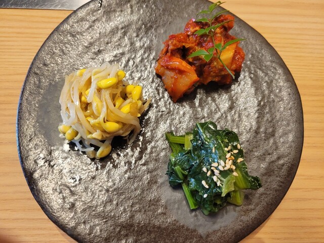 まずは前菜から。てんぺいきむち/豆もやしナムル/小松菜のナムルがやってきました。
