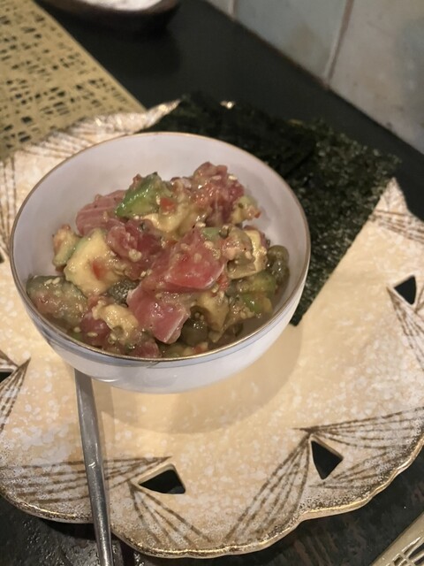 先ずは本日の前菜5種盛りからスタートし穴子のカリカリ焼きやマグロとアボカドのサラダなどをいただきます