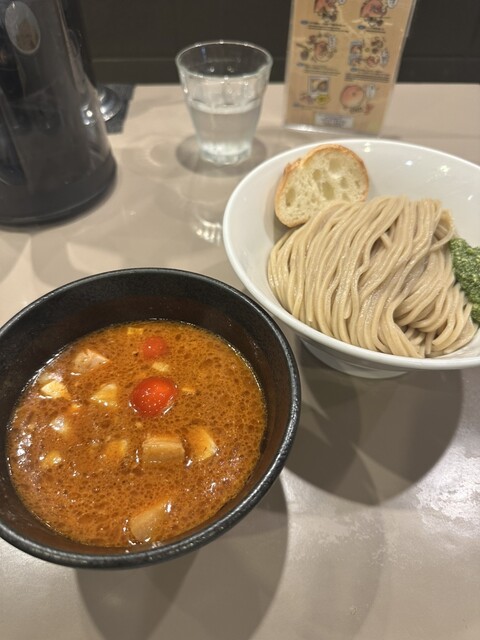 1100円のエビトマトラーメン(並)に、300円のモッツァレラチーズをトッピング!