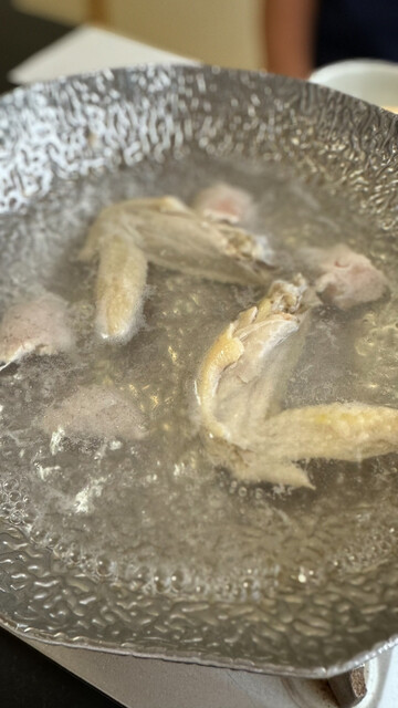 ①だし入りシャモ鍋にまず湯がいてある手羽を入れるよ