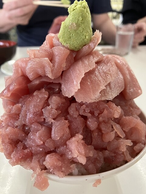 メディアで多く紹介されているデカ盛りのお店に訪問。まぐろ丼の選択肢は、中・小・ミニ。中は一人では食べられないと店員さんに断言されたので、小でチャレンジ。運ばれてきたのは写真にあるとおりまぐろが立体的に盛られた迫力抜群のまぐろ丼!ご飯の量はお茶碗一杯分ながら、まぐろのボリューム満点でお腹いっぱいにしてもらいました!