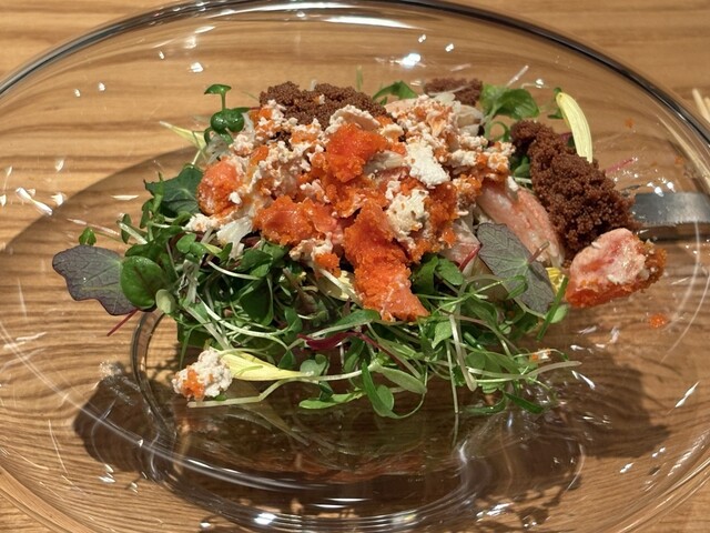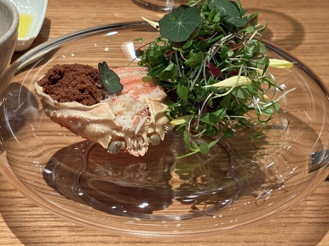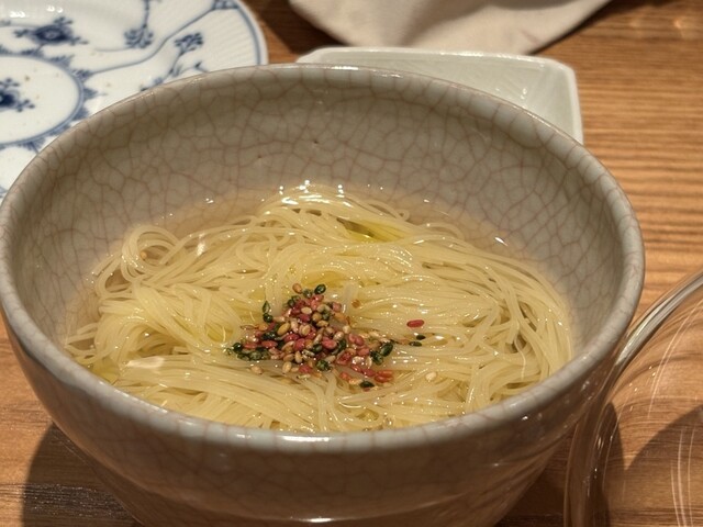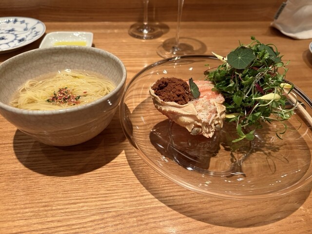 ★冷製麺パスタ(カッペリーニ)、もずく、トマトエキススープ、香箱蟹(間人)、ハーブサラダ