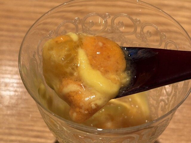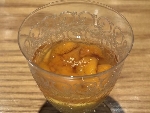 貝柱のコンソメジュレ 赤雲丹 じゅんさい
