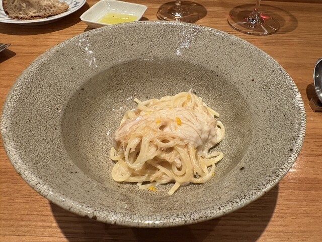 ★暖かいパスタ、フカヒレ、フグ白子ソース、柚