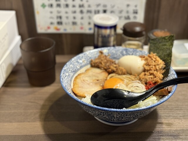丼には濃厚ダレをまとった太麺、その上にほぐしチャーシュー、卵黄、魚粉——視覚からもう美味い。