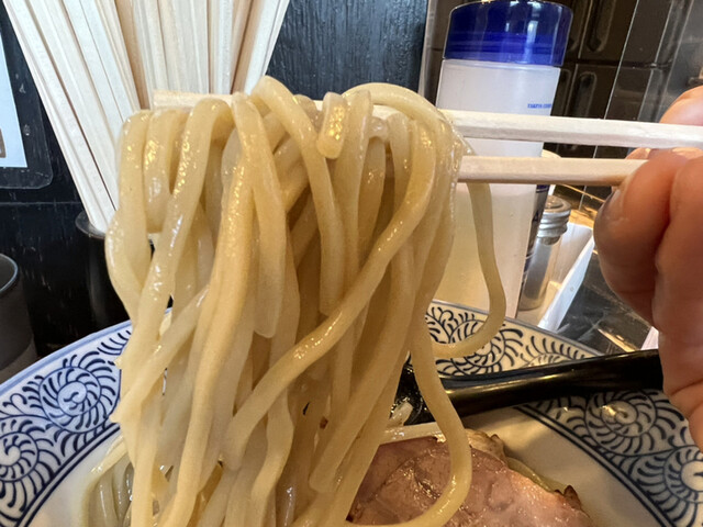 平打ちの自家製麺はモチモチの食間。平打ちなので茹で時間も短縮で回転も良さそう。