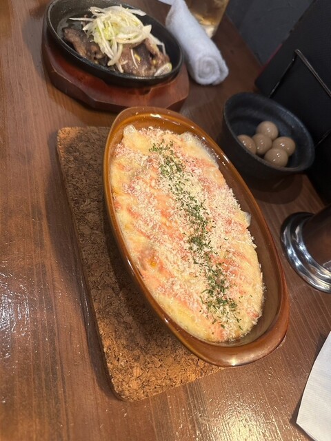 今回は肉料理を中心に注文しました。まず最初にいただいたのは「肉寿司」。肉の旨味がしっかり感じられ、口に入れた瞬間に広がるおいしさに後輩と二人で「これは美味しい!」と盛り上がりました。続いて頼んだのは「グラタン」。クリーミーなソースがたっぷりで、表面のチーズの香ばしさがたまりません。寒い時期にぴったりの一品で、心も体もほっこりと温まりました。