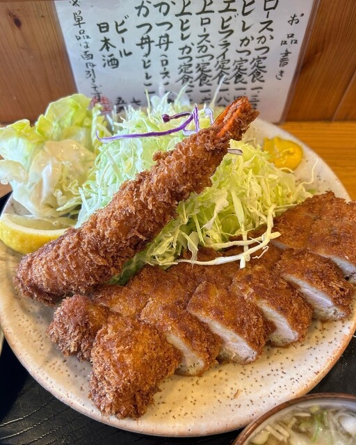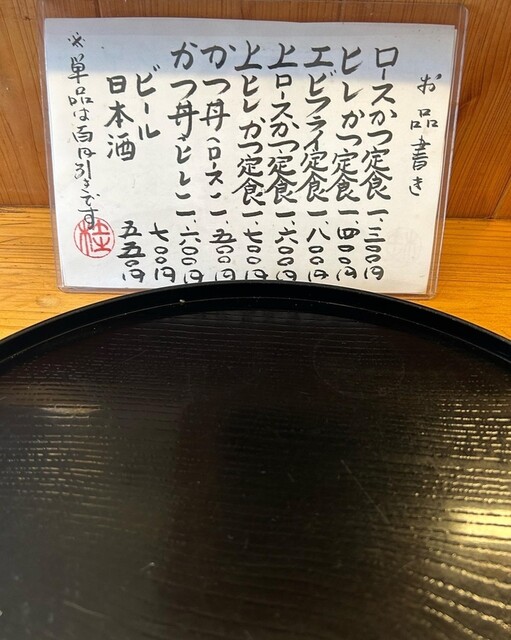 お品書きはロースカツ、ヒレカツ、海老フライ、上ロース、上ヒレカツ、カツ丼(ヒレかロース)