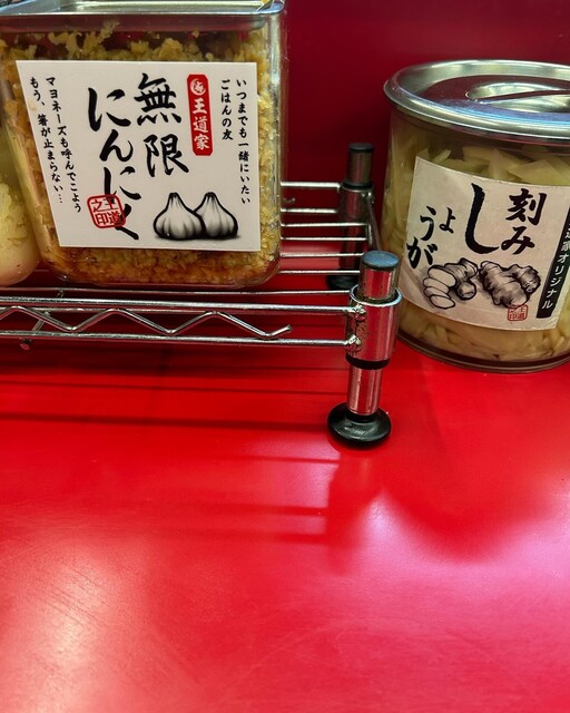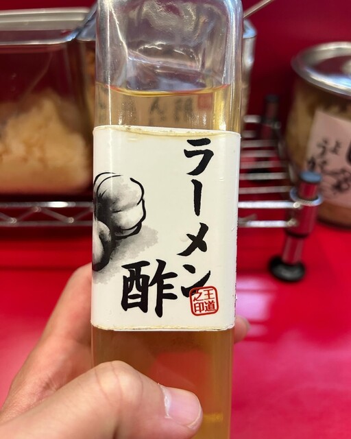 卓上の三大天であるラーメン酢、刻み生姜、無限にんにくが最高