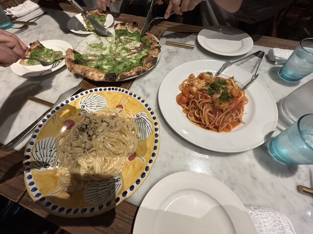 ナポリピッツァのモチモチ生地、夜のライトアップされた店内で食べると雰囲気も良いです。