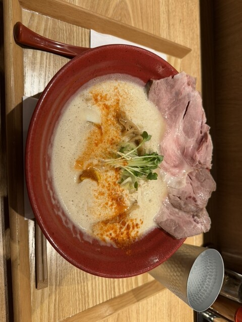 何回食べても美味い。とり白湯スープは濃厚で鶏の旨みがたまらない。チャーシューも大きなのが3枚。煮卵半割りが二つ。それに支那竹。麺はストレート麺ながらスープが絡みやすい。白髪ネギとともに絶妙なハーモニーだ。ブラックペッパーやレモンで味変も良い加減に味が変わって楽しめる。月一回は食べたい。