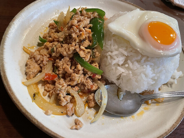 自分の中ではここのガパオライスが1番好きです。本来油っぽいお肉が合う料理だと思ってましたが、油分の少なめな胸肉が使われており、脂っぽくないのですが、お肉が絶妙な味付けをしっかり吸い込み、最高の一品になってます。
