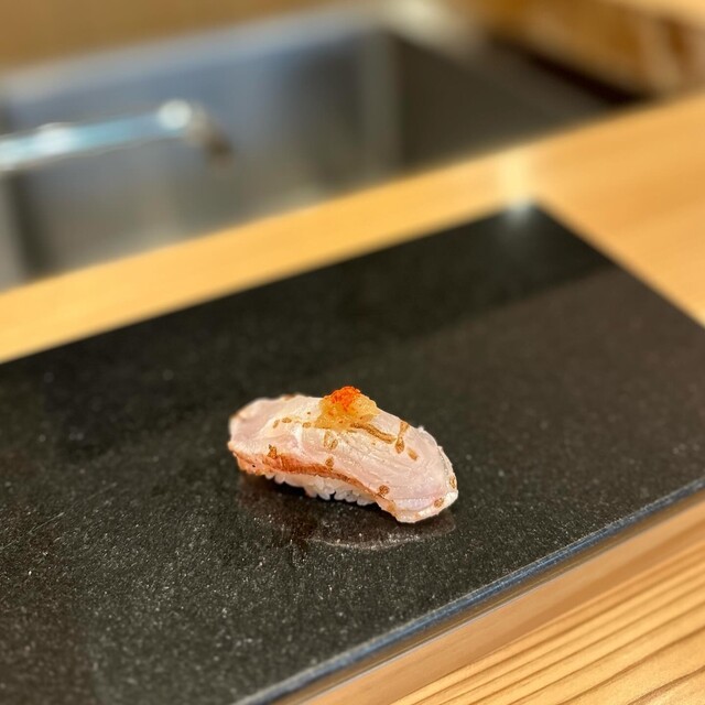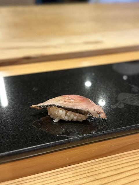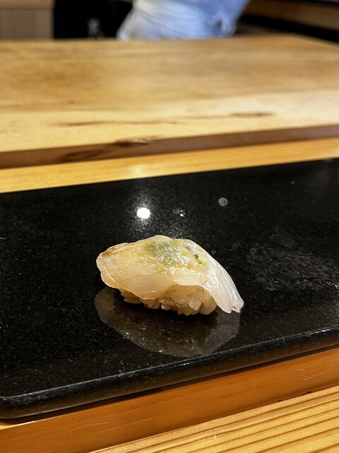 鯛、大間のマグロ、かんぱち、鰆(旨い)、かじき (旨い)、鯵、ハガツオ、筋子、カマス(旨い)、寒鰤(やばい)、ヤリイカ(絶品)、車海老、うに、有明の海苔の中トロ大間(やばい)、玉子焼きをいただく。