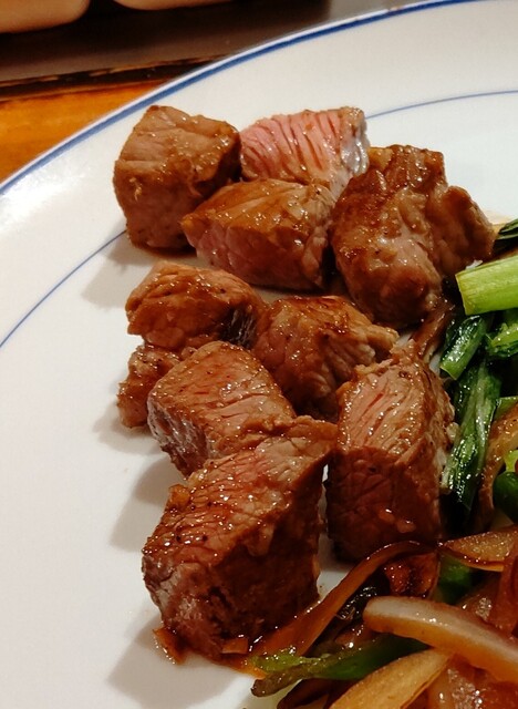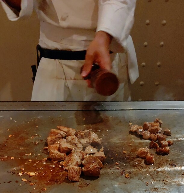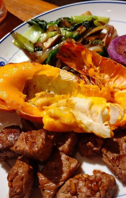 コックサマーは、付け合わせの野菜を、塩をくるくるくるくる回しながら降ってます➰(o^∀^o)楽んのしいーヾ(*´∇`)ノヾ(*´∇`)ノお肉も同様に焼いて頂きます➰(o^∀^o)伊勢海老は、オーブンで焼いたのが運ばれます➰(o^∀^o)サー!ステーキです➰柔らか!!美味しいです➰(*≧∀≦*)伊勢海老、噛めば噛むほど海老‼️お値段以上です➰ヾ(*´∇`)ノ