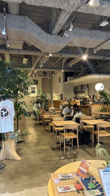 店内は天井が高く、木を基調とした北欧テイストの落ち着いた空間。植物やアート作品が配置されていて、席はカウンター・テーブル・ソファ席など多め。平日昼はパソコンで作業されている方が多く、一人でも利用しやすい雰囲気です。