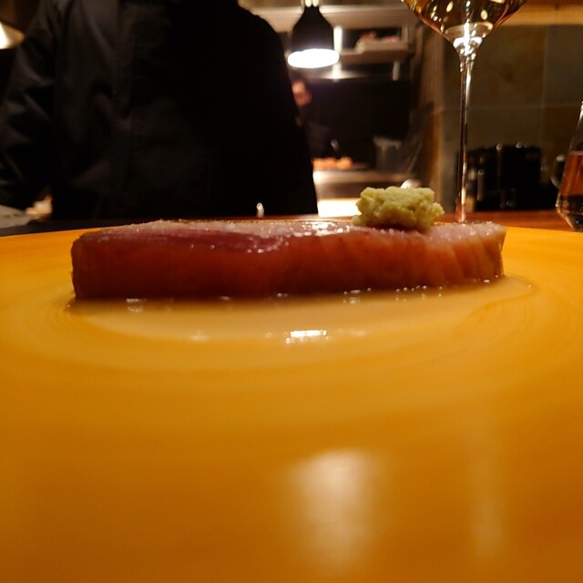 料理は神経締め目近鮪にお米と中国甘酒のソース。