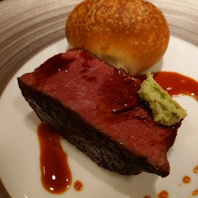 筋や骨をフォンドボーにして、すね肉を加えデミグラスソースにしてるとのこと。