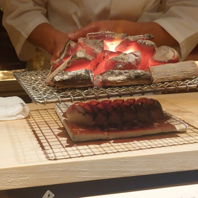 目の前で炙って提供されるのは銚子の鯖の棒寿司。