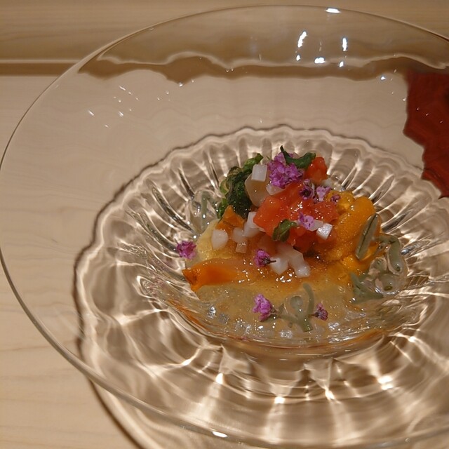 クレソン、赤貝、蓴菜の異なる食感と雲丹の甘味とジュレの酸味が交じり合って美味しい。
