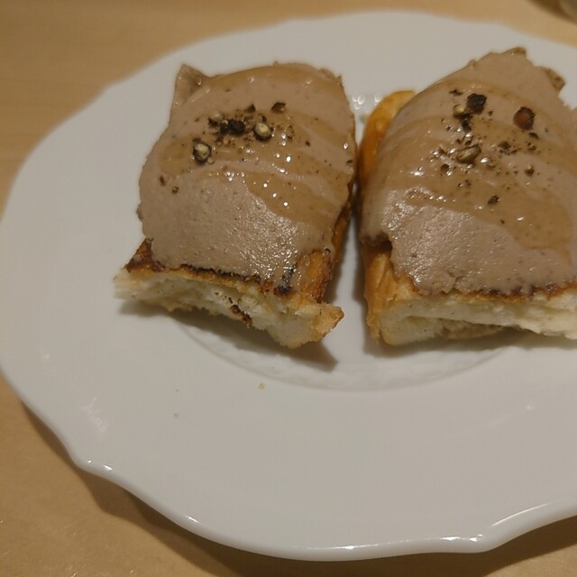 さくふわのパンの上にはちみつを垂らしたレバームースがたっぷり。