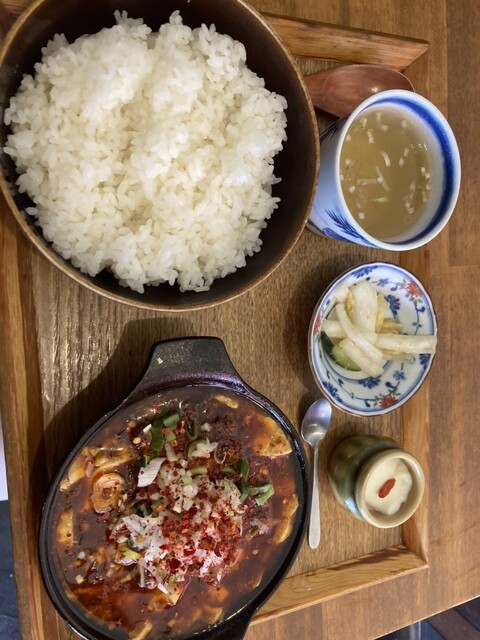 結局太田先生のテレビで見た方じゃなく、そこのログで鉄鍋ででてくるって書いてあった梶原の方にする、鎌倉駅からはちょっと離れてる。13:20頃だったからか待ちなし半分以上が空席でした。麻婆豆腐定食ご飯大盛り1100円、コロちゃんは水餃子定食1100円にする。他にルーロー飯と汁無担々麺がある。トイレは外。テーブルに山椒2種類と七味じゃなく一味がある。まず麻婆豆腐、山椒、どっちがどっちの説明、鉄鍋グツグツって程じゃなかったちょっとがっかり、けど豆腐が柔らかく油が美味しい、なかなかでした、少しもらった水餃子も醬油ベースのタレがよくあって、美味しい。それと杏仁豆腐、これが一番気に入りました。今度は今回食べてない担々とルーローかな。