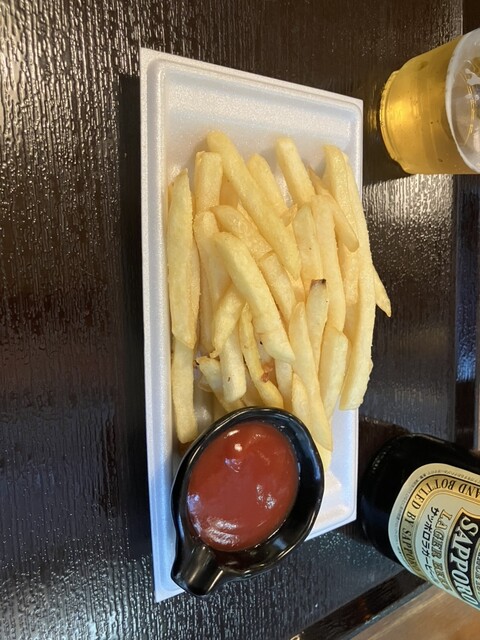 人形町A5を左に出て数分、15:15店着。先客なし、瓶ビール700円とフライドポテト350円の食券を購入し受け渡し口でビールをもらい席へ。やっぱ中瓶でした。営業の頃よく来てた小舟町、、懐かしいや。中3日空けたし30近く走ったし美味い!フライドポテト、揚げたてでこれも美味い!この店いいね!あっという間にビールがなくなっちゃって、飲み放題にすれば良かったって後悔、生ビール500円を買い店員に渡す時飲み放題の話しすると今からでも変更できますよって!!ヤッタァーって思ったけど瓶は入らないって説明、、なので飲み放題への変更は諦め。ちゃんと説明すればよかったですね、ってお詫びしてくれる、いい店員、そしたら、暫くするとサービスですってわらさ(か、ぶり?)の刺身をくれる、マジ!また来てくださいって、はい!そうしまーす!わらさ、美味い!大葉も大根のツマも大変いい!でも、そろそろお終い1550円。