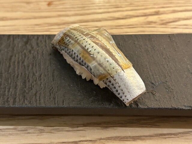 次は、すみいか、このコリコリ感が堪らない美味です。そして、出ました青物のチャンピオン千崎のアジ❣️あぶらののりとネギ醤油、赤酢、ワサビのハーモニーに、やられました(^。^)笑